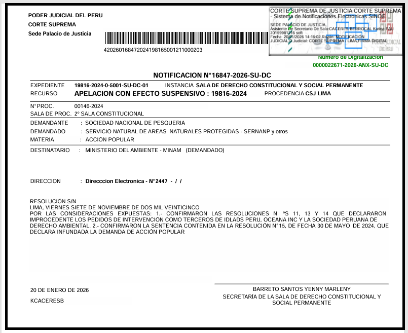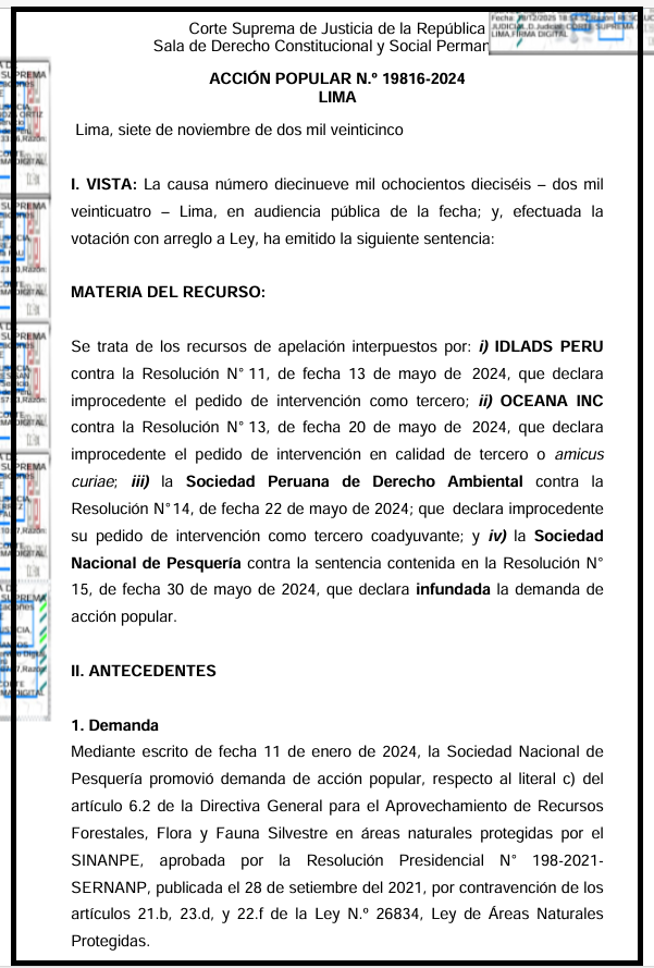 En síntesis, la sentencia del caso de Acción Popular N.º 19816-2024 LIMA presenta una clara dualidad. Por un lado, el fondo de la decisión es un logro crucial para la conservación de los ecosistemas marinos peruanos, al blindar jurídicamente a las Áreas Naturales Protegidas de la pesca industrial. Por otro, la forma en que se gestionó la participación procesal sienta un precedente preocupante que restringe el rol de la sociedad civil en la defensa del medio ambiente.