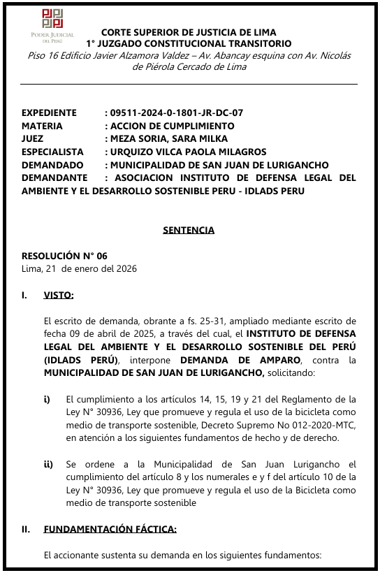 La sentencia dictada por la Jueza Sara Milka Meza Soria el 21 de enero de 2026 es un acto de justicia distributiva en el distrito más poblado del país. Al corregir la desidia administrativa, el fallo asegura que San Juan de Lurigancho se alinee con los estándares nacionales de movilidad y los compromisos internacionales de mitigación climática.