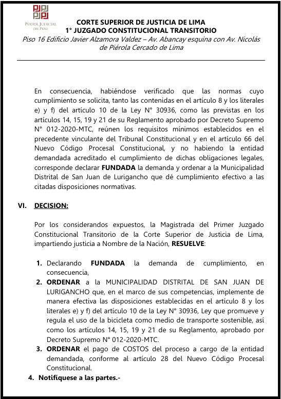 Este fallo representa un avance sustancial en la materialización del Derecho a la Ciudad mediante el uso de garantías constitucionales. Al declarar fundada la demanda, el Poder Judicial valida un modelo de planificación urbana donde la jerarquía vial se invierte, priorizando al ciudadano y al ciclista sobre el vehículo motorizado. La orden de integrar la infraestructura ciclovial en los instrumentos de gestión urbana (Art. 19.2) obliga a San Juan de Lurigancho a reformular su estructura vial desde una perspectiva de accesibilidad y seguridad.