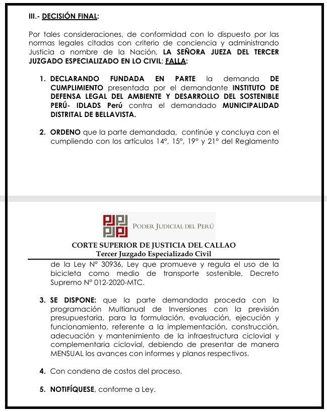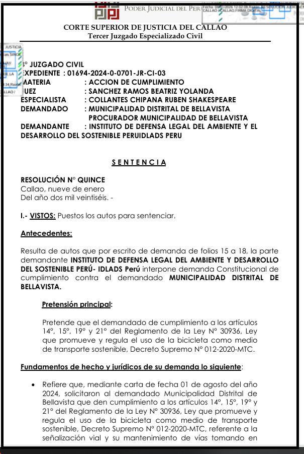 Celebramos la decisión de la jueza Sanchez Ramos del Tercer Juzgado Civil del Callao. Ahora, el llamado es a la comunidad de Bellavista: mantenerse vigilante, participar y apropiarse de esta victoria. Es responsabilidad de todos asegurar que cada pedalada de este triunfo legal se traduzca en un futuro más verde, seguro y humano para las generaciones presentes y futuras.